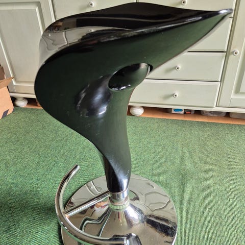 Justerbar kontorstol bar stol. på hjul i rød plast med forkromet metalfod. Stolen har rund, formet sædeskål og gaspatron til højdejustering via håndtag under sædet. Fembenet fod med drejefunktion og plastikhjul, velegnet til brug ved skrivebord, arbejdsbord eller som taburet i hjemmet eller på kontor. Sædehøjde kan justeres, og sædet måler ca. 35 cm i diameter ifølge målebånd på billederne.