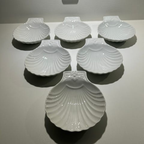 Pillivuyt porcelæn. Sættet består af to små skåle formet som muslingeskaller. Skålene er velegnede til servering af mindre portioner som snacks, tilbehør eller dips. Klassisk hvid glasur og rillet struktur på indersiden understreger muslingeformen. Undersiden er mærket med producentangivelse. 8,5x6cm