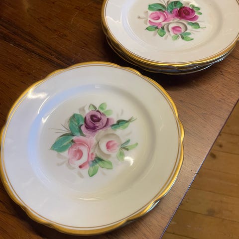 Sæt dekorative desserttallerkener i porcelæn med gennembrudt kant og guldfarvet dekoration. Tallerkenerne har blomstermotiv i midten i afdæmpede farver. Velegnet til servering af dessert, kage eller som pynt på bordet. På nogle af tallerkenerne ses mindre skader på kanten, som vist på billederne.