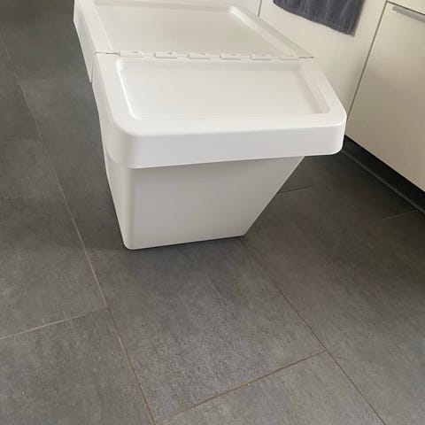 IKEA køkkenopbevaring med fire hvide plastbeholdere på skinne. Velegnet til opbevaring af køkkenredskaber, bestik eller småting på væg eller anden lodret flade. Beholderne er aftagelige fra skinnen, hvilket gør det nemt at rengøre og omorganisere indholdet. Neutral hvid farve, der passer ind i de fleste køkkener.