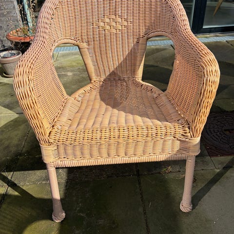To fine og velholdte rattanstole med armlæn. Farven er grå. Jeg har passet godt på dem og de fejler intet. Siddehøjde 44 cm og højde ryglæn er 93 cm. Fra ikke-ryger hjem. Sælges samlet for 150 kr.