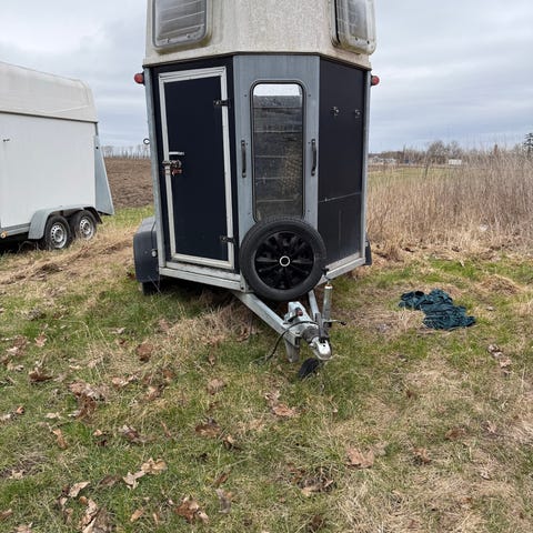 Hestetrailer med to aksler. Traileren har bagrampe med øvre klap, markerings- og baglygtefunktion samt nummerpladeholder. Foran er der dør i siden og træk med næsehjul samt monteret reservehjul. Indvendigt ses opdeling med bomme og plastskillevæg.