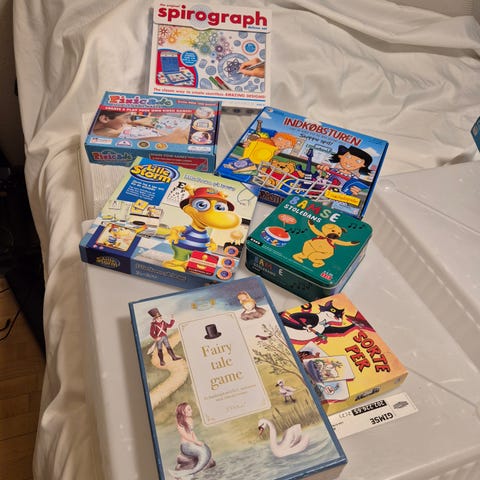 Blandet parti brætspil og kortspil til familie og børn. Pakken indeholder flere forskellige spil, herunder quiz- og vidensspil, børnespil med fokus på alfabet og bogstaver samt kortspil til samtale og underholdning. Spil egner sig til indendørs brug og kan spilles af flere deltagere ad gangen. Velegnet til familieaftener, hyggestunder og leg, hvor både børn og voksne kan være med afhængigt af de enkelte spils aldersanbefalinger.