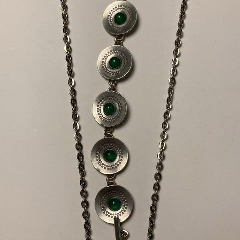 Sæt bestående af armbånd og halskæde til kvinde. Armbåndet har led med blomsterlignende form og forbindende stave mellem hvert led. Halskæden har en fin kæde med rund lås. Materialet er tin. Velegnet som smykkesæt til daglig brug eller ved særlige lejligheder.