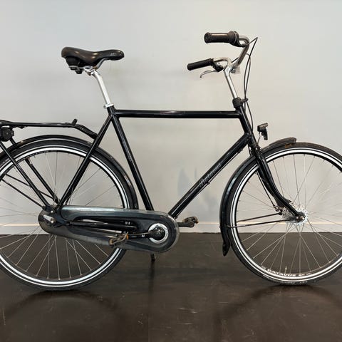 Herre bycykel i størrelse M med 28" hjul. Cyklen har klassisk herrestel og er velegnet til daglig kørsel i byen. Farven er sort, og cyklen er udstyret med skærme og fast saddel. Egnet til mandlig rytter, der ønsker en enkel og funktionel hverdagscykel med standard hjulstørrelse på 28"/700c.