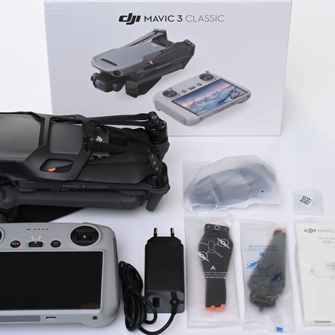 DJI Mavic drone med fjernbetjening, tre ekstra batterier og hård transportkuffert. Sættet omfatter drone med foldearme og fire propeller monteret, ekstra propeller, fjernbetjening med indbygget skærm, tre batterier, oplader og diverse mindre tilbehørsdele. Egnet til luftfoto og videooptagelser, hvor der er behov for stabil flyvning og mulighed for transport i robust kuffert.