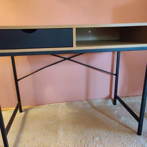 Sælger mit smukke lille skrivebord. Det er brugt men i fin stand. Flot træbord med sorte detaljer.