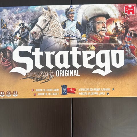 Jumbo Stratego Original brætspil. Klassisk strategispil for to spillere, hvor hver spiller opstiller en hær på spillepladen og forsøger at erobre modstanderens flag. Spillet indeholder spilleplade, spillebrikker med forskellige rangordener samt kort markeret som battle cards. Regler og tekst på æsken er på skandinaviske sprog.