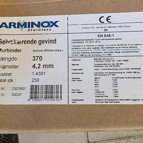 Arminox selvskærende gevind murbinder i rustfrit stål, . Murbinderne har en længde på 320 mm og en diameter på 4,2 mm. Velegnet til murværkskonstruktioner, hvor der kræves rustfri murbindere med selvskærende gevind. Leveres i kasse har 870stk