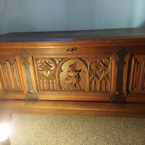 Træ skranke eller disk i hjørneformet modul. Ydersiden er malet lyseblå med hvide fyldningsfelter og profileret kant øverst. Indersiden er hvid med panelopdeling og plads til at stå bag skranken. Velegnet som receptionsskranke, prædikestol eller informationsdisk i mindre lokaler. Materiale: træ med malet overflade i lyseblå og hvid.