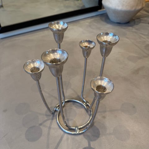 Georg Jensen lysestage i metal. Tredelt stage med tre lyseholdere i forskellig højde, samlet i én organisk form. Overfladen er i blankt metal med plads til lys i midten af hver skålformet top. Velegnet som borddekoration eller til brug på hylder og vindueskarme.