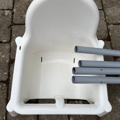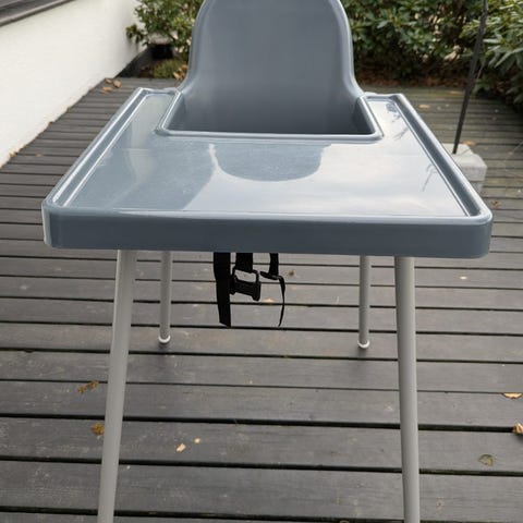 IKEA højstol i rød plast med metalben. Højstolen kam hjælpe med at holde barnet sikkert på plads under måltider. Sædet er glat og kan tørres af med en fugtig klud, hvilket gør den praktisk i hverdagen. Velegnet til brug ved spisebordet til små børn, der har brug for støtte til at sidde oprejst.