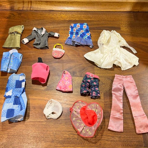 Tøjet er i forskellige farver og mønstre og passer typisk til standard Barbie-størrelse.