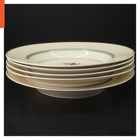 Dette er et sæt af fem porcelænstallerkener, hver med et blomsterdesign i centrum. Tallerkenerne har en diameter på 24,5 cm og kommer med en fin kant i grøn og gylden. Tallerkenerne er ideelle til servering af måltider og kan være en elegant tilføjelse til ethvert køkken. De har et klassisk design og er stemplet i bunden med producentens logo.