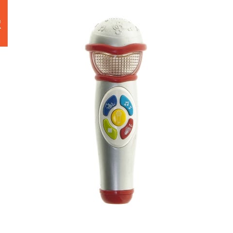Denne mikrofon er lavet af plastik og er designet til børn. Den er rød, gul og grøn med et billedmotiv på siden. Mikrofonen har en håndholdt form og en snor til fastgørelse. Størrelsen er 24,5 cm.