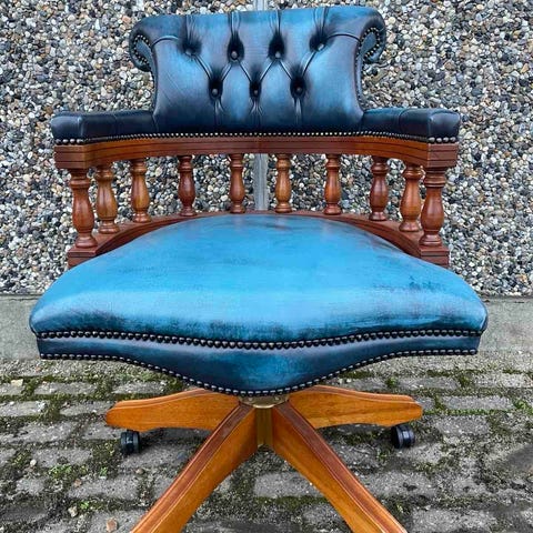 Chesterfield drejebare skrivebordsstol i mahogni med sort læderpolstring, fra 1990’erne, lavet i Storbritannien, i god brugts tilstand med mindre tegn på ældning og pletter, mål ca. 103 cm høj, 65 cm bred og 65 cm dyb, sidestøjde ca. 51 cm og sæde 50 x 50 cm, vægt 25 kg, leveres i to dele til transport. Klik på den blå "gå til varen" knap, for at købe eller byde på denne vare. Den samlede pris vil blive vist inden du afgiver dit bud.