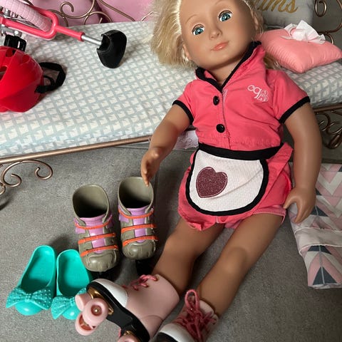 Dukken har rødt hår og kommer med tøj, taske og sko som på billederne.