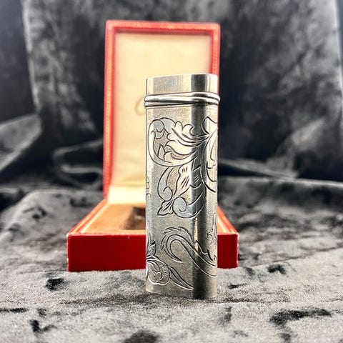 Guldtekstureret krop dækket af farverige emaljefarver, der giver det et rigt ornamenteret udseende. Kombinationen af rød, blå og hvid emalje med det detaljerede gyldne mønster får det til at føles næsten som et stykke smykke snarere end blot en lighter. Cartier dekorative modeller som denne skiller sig altid ud i en samling.