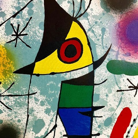 Joan Miró litografi Parler Seul, underskrevet på pladen, i fremragende stand, 60 × 45 cm ark (billedet 42 × 33 cm), oprindelse Frankrig, begrænset udgave på 1000 eksemplarer (2004), litografi, abstrakt stil. Klik på den blå "gå til varen" knap, for at købe eller byde på denne vare. Den samlede pris vil blive vist inden du afgiver dit bud.
