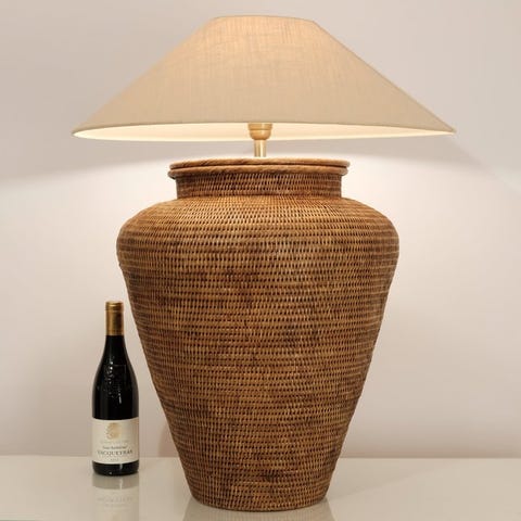 Lampenfoden af denne spektakulære bordlampe er lavet af naturligt siv og har formen af en stor gryde med låg, som traditionelt fletes i Myanmar/Birma.