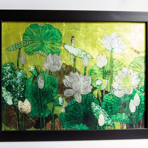 Painting of Asian Lotus - Lacquer Painting with Mother-of-Pearl and Golden Le...