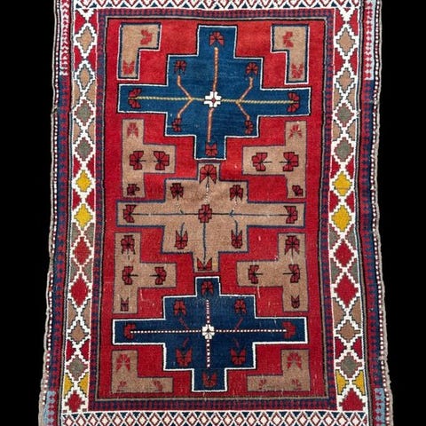Smukt og særegent tæppe fra Kars Kazak med et meget særligt ikonografisk motiv, vævet i Tyrkiet omkring 1980’erne, i fuld uld, i god stand, mål 145 x 90 cm. Vegetabilske farver.