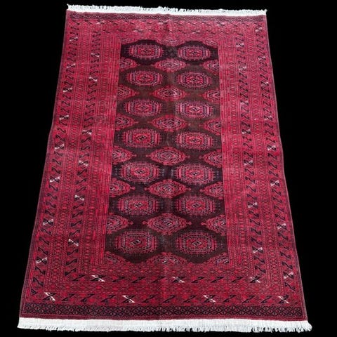 En Buchara håndbundet tæppe af uld på bomuld fra Pakistan, målene 186 x 132 cm, århundrede XXI, generelt god stand, én genstand. Klik på den blå "gå til varen" knap, for at købe eller byde på denne vare. Den samlede pris vil blive vist inden du afgiver dit bud.