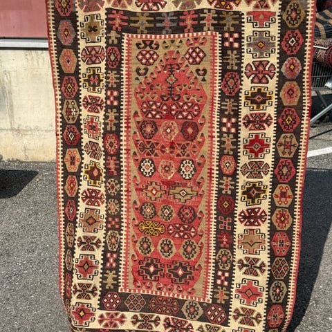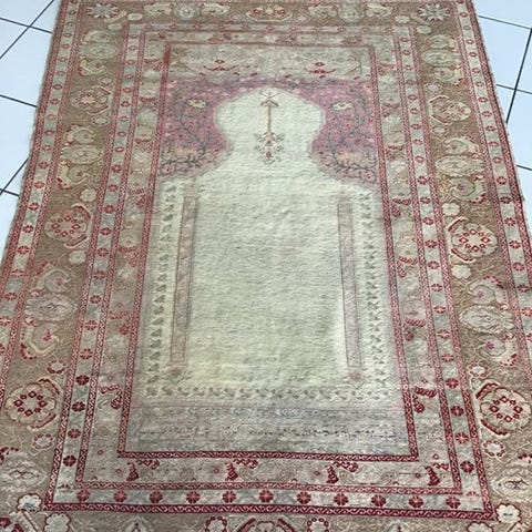 Tyrkisk bønnerug origin fra Türkiye, model Turkish Prayer Rug, 187 × 121 cm, uld på bomuld, tidligt 20. århundrede, generelt i rimelig stand med tegn på ældning og brug og en plet. Klik på den blå "gå til varen" knap, for at købe eller byde på denne vare. Den samlede pris vil blive vist inden du afgiver dit bud.