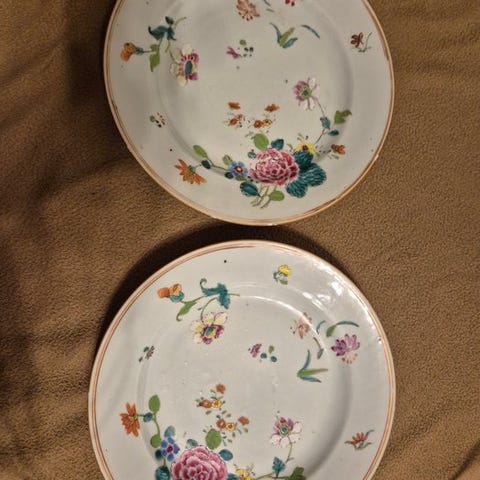 Par dekorative porcelæns-tallerkener med kinesisk-inspireret udsmykning, fra sene 1800-tallet – begyndelsen af 1900-tallet.
