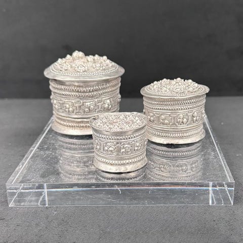 Betelnøddeæske af 925 sølv med repoussé drage dekoration, lavet af Hmong i Vietnam i første halvdel af det 20. århundrede; mål 4,5 × 5,3 × 5,3 cm, vægt 48 g, i fremragende stand. Klik på den blå "gå til varen" knap, for at købe eller byde på denne vare. Den samlede pris vil blive vist inden du afgiver dit bud.