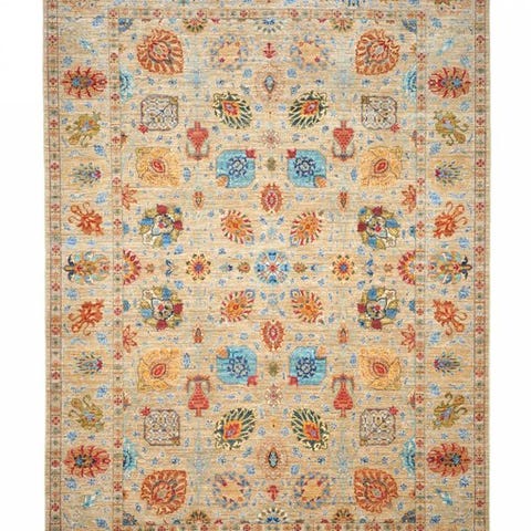smukt håndknyttet tæppe af uld. Bomuld er på en naturlig måde farvet uden kemikalier. Hovedfarverne er rød, creme, blå og grøn. Tæppet er med en smuk professionel stram knude og har korte frynser.