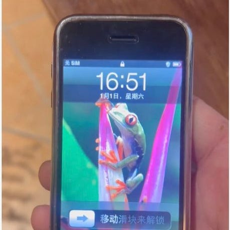 Dette er en iPhone 1 (første generation), en sjælden britisk version, en retrotelefon, en vintage-telefon. De to serienumre stemmer overens (serienummeret angivet i sektionen « Om denne telefon » og det graverede bagpå enheden skal være identiske; det er et afgørende verifikationsskridt). Model A1203, iOS 1.1.1 (iOS 1 er utroligt glat og perfekt tilpasset til iPhone 1). Telefonen er ikke jailbroken, skærmen fungerer som normalt, der er ingen væskelækage, berøringsskærmen fungerer korrekt, batteriet er i god stand, skærmen viser ingen tegn på aldring, bagsiden har nogle oxidationstriber, ridser og buler, tænd/sluk-knappen er let nedtrykket og kræver en negl for at blive aktiveret.