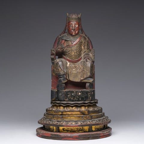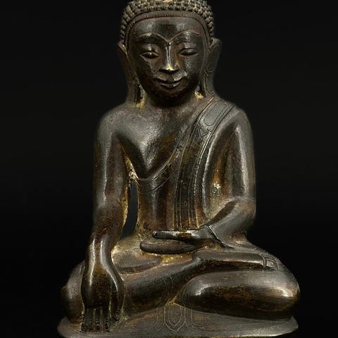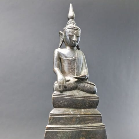 Gammel birmansk Shan-buddha i træ med håndsnit og bladguld, seneste XIX århundrede Konbaung-periode; mål 31 × 17 × 9 cm; oprindelse Casa d'aste; god stand; original. Klik på den blå "gå til varen" knap, for at købe eller byde på denne vare. Den samlede pris vil blive vist inden du afgiver dit bud.