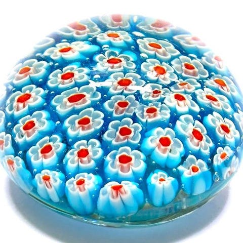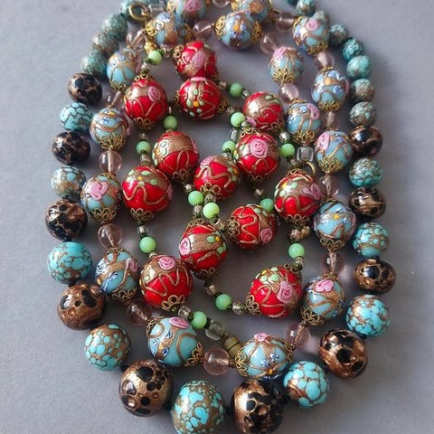 Tre halskæder med originale venetianske Murano Millefiori-perler fra 50'erne/60'erne. Halskædernes længder er 52, 60 og 75 cm. Alle tre halskæder er nystrenget og i meget god stand.
