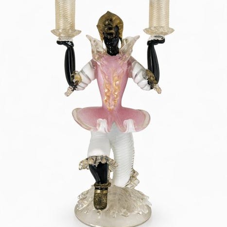 Her er en smuk mundblæst glas-skulptur i Murano-stil. Dette stykke forestiller en venetiansk figur, der holder en lysestage. Glasarbejdet er særdeles fint, med delikate detaljer der giver liv til denne unikke skabelse. Perfekt til at tilføje et strejf af elegance og sofistikation til din indretning, denne glas-skulptur er en sand kunstgenstand at beundre.