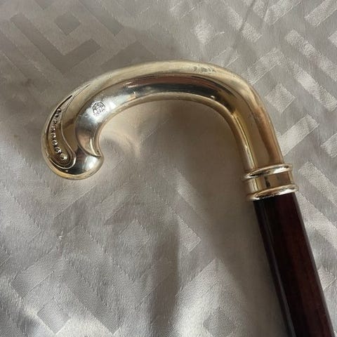 Sølvbeslaget er hallmarket, selvom mærkerne er delvist slidte og ikke fuldt læselige. Løve i passants bærer stadig tydeligt præg, hvilket angiver sterling sølv, og London-prøveremærket er også synligt. Magerens mærke ser ud til at læse “E.N.”, tilskrevet Edward Newton, en britisk sølvsmed, der var aktiv i slutningen af det 19. århundrede og det tidlige 20. århundrede, hvis værksted fremstillede sølvmonterede genstande som gåstavshåndtag, paraplyfæstninger og små tilbehør.
