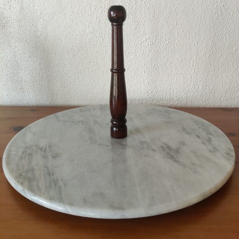 Serveringsfad eller kageplatte i marmor med ét håndtag i lakeret træ placeret i midten og fadet er med 3 små "gummisko" som "fødder"