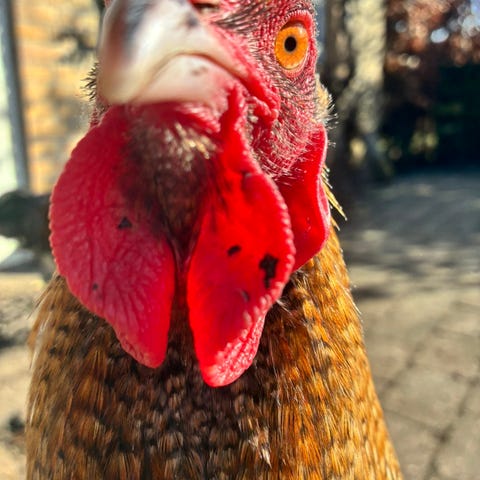 Smuk grønlæggerhane fra september ‘25. Efter sort/kobber Maran og Creme Legbar. Ikke helt færdigudviklet, men er blevet kønsmoden. Opfører sig pænt overfor både to- og firbenede.