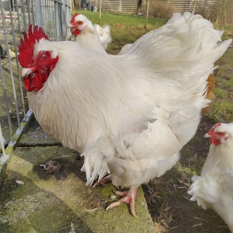 Fra lille, økologisk hobbyhold. Grundet den aktuelle situation med fugleinfluenza er det kun muligt at få fremvist hanen udenfor hønsegården.