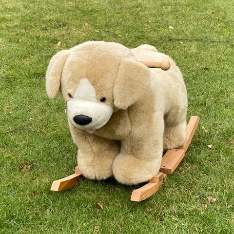 Mini Brands gyngehund plys legetøj i brun og hvid med træmeder og håndtag. Sædet er polstret og formet som en stol med ryglæn for ekstra støtte til mindre børn. Hunden har tørklæde med prikker og blød overflade, der er behagelig at røre ved. Egnet som gyngelegetøj til små børn, der kan sidde selv. Velegnet til indendørs brug på jævnt underlag.