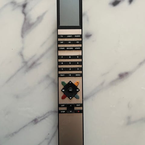 Bang & Olufsen fjernbetjening i sølv og sort. Fjernbetjeningen har klassisk B&O design med numeriske taster, funktionsknapper og navigationsknapper. Egnet til styring af kompatible Bang & Olufsen anlæg eller tv, afhængigt af model og opsætning. Materiale fremstår som kombination af metal og plast.