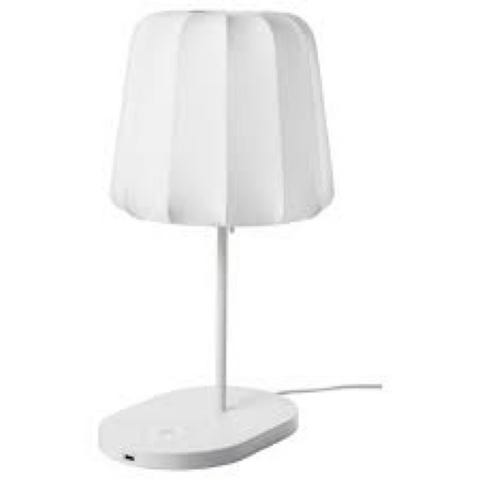 IKEA FNUKRA bordlampe og vækkeur i meget mørkeblå og hvid plast.