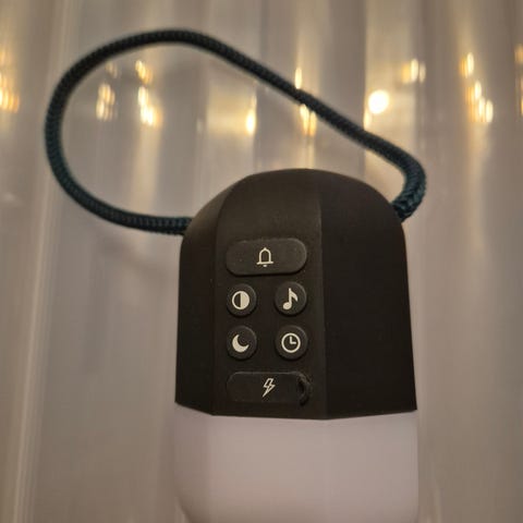 10 cm høj. Lampen/vækkeuret har bærestrop og betjeningsknapper på fronten.
