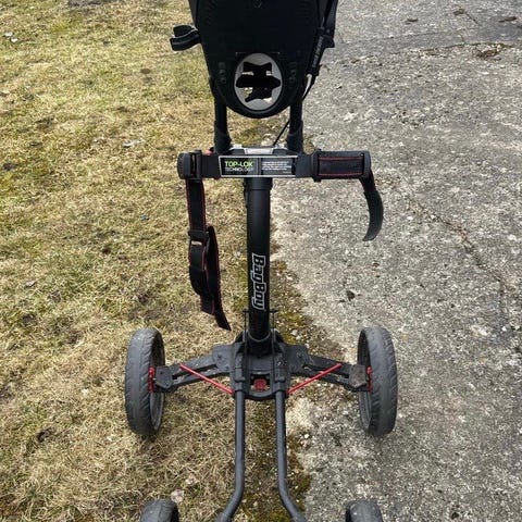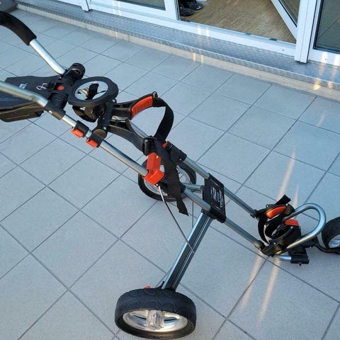Meget fin BagBoy golfvogn, med fire hjul, kun 3 år gammel. Kører perfekt. Rum til bolde, tees mv, vandflaske, ophæng til paraply. Kører perfekt og holder stille når der er brug for det :-) Kan klappes sammen så den er nemt at have med i bilen. Taske og jern mv følger ikke med, men sælges i anden annonce.