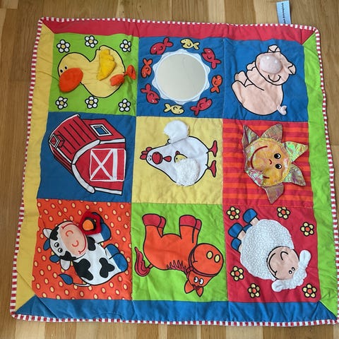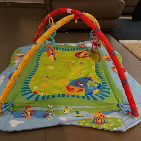 Fint aktivitetstæppe til baby med jungletema. Legetøj kan flyttes rundt og bøjler kan tages af hvis man kun vil bruge tæppet. Nyvasket (parfumefrit) og klar til ny lille baby ❤️