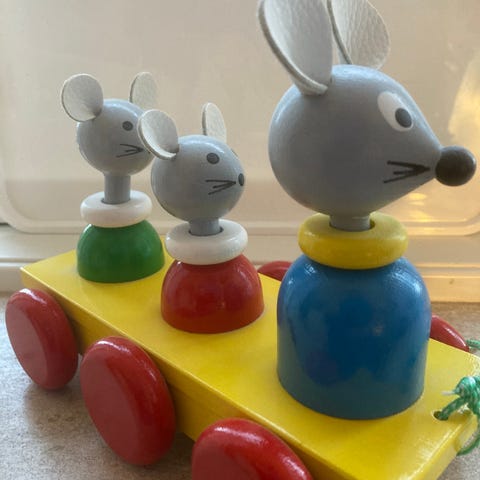 Grå i blik på ca 8.3 x 3 cm med 2 hjul under og har kunne “løbe” afsted og den anden i fint lakeret økologisk flet på 9 x 5 x 4 cm og har kunne hoppe
