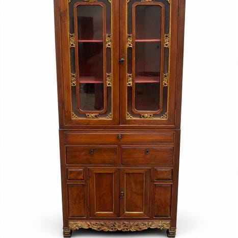 Vitrineskab i mahogni træ med to glaslåger på fronten. Skabet har metalbeslag og lukketøj på forsiden samt bærehåndtag i metal på siden. Indvendigt er der én hylde, som giver to opbevaringsrum.
