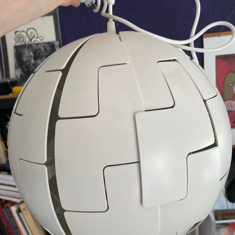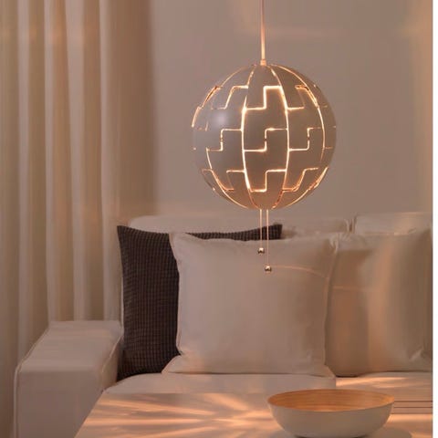IKEA PS 2014 loftlampe er inspireret af science fiction-film og vinder af prisen Red Dot Award, som uddeles ved en international designkonkurrence. Lampens form og lysets intensitet kan ændres ved ganske enkelt at trække i snorene.
