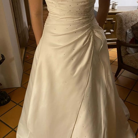 Brudekjole til kvinde i hvid farve. Kjolen har langærmet blondeoverdel med gennembrudt mønster og rund halsudskæring. Nederdelen er vid og gulvlang med flere lag stof, som giver et fyldigt skørt. På overdelen og ned over skørtet er der placeret blondeapplikationer som dekorative detaljer. Velegnet som klassisk brudekjole til bryllup.