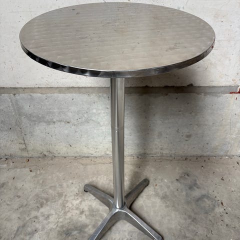 Rundt cafébord med glasplade og metalstel i grå farve. Særligt bordet er ikke nyt længere, men helt sikkert noget som kan friskes op. Sættet er egnet til udendørs brug på terrasse, altan eller i have.